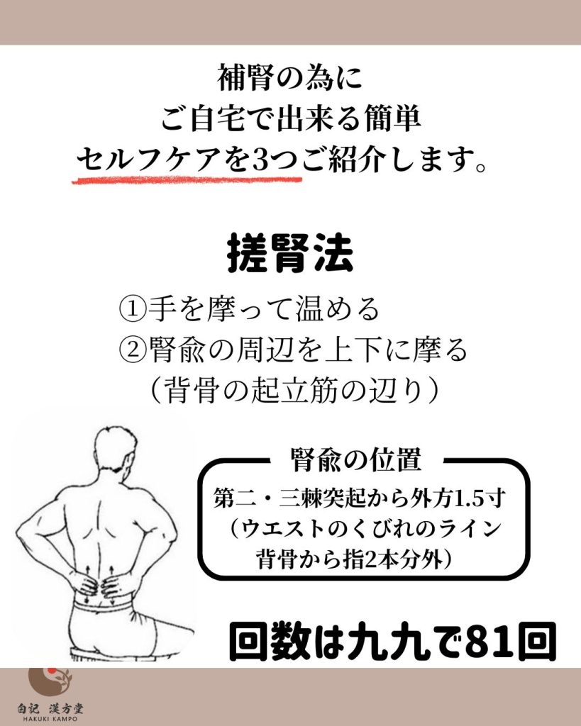 News おうちで簡単補腎セルフケア 2026.01.15 Tweet Share Hatena Pocket RSS feedly Pin it COPY Title&URL 白記漢方堂です。年末になり冬も本番の寒さになってきました。 こんな時にはご自宅でできる簡単補腎法をお勧めします。簡単ですが体がポカポカしてきますよ。 Tweet Share Hatena Pocket RSS feedly Pin it COPY Title&URL 1/15(木)12:00~17:00不在のお知らせ Prev post 睡眠の時間気にしていますか? Next post