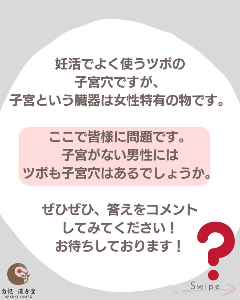さて、臓器の子宮は女性にしかありませんが、男性には子宮穴というツボはあるでしょうか。