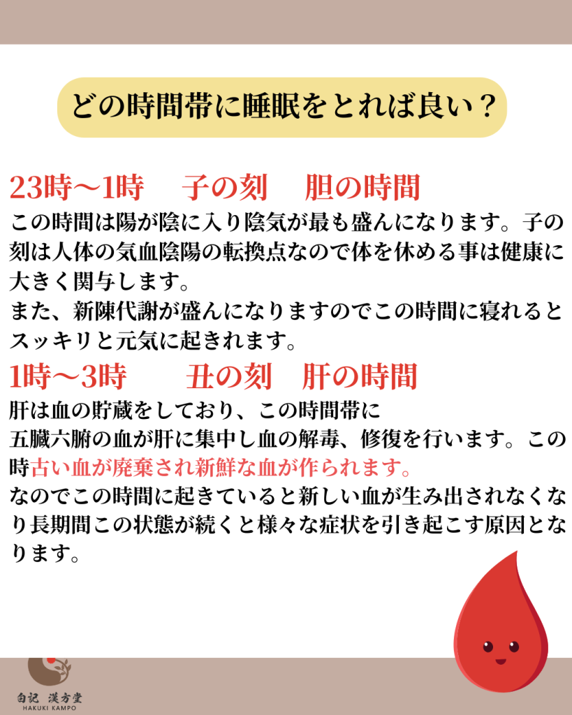 News 睡眠の時間気にしていますか? 2026.01.21 Tweet Share Hatena Pocket RSS feedly Pin it COPY Title&URL 皆さんは睡眠時間を気にしていますか。何時間寝たかは気にしている方は多いとは思いますが時間帯は気にしていますか? 中医学には子午流注という概念があり時間によって臓器の時間が決まっています。特に寝るのに良いタイミングがありますので是非ご覧ください。 Tweet Share Hatena Pocket RSS feedly Pin it COPY Title&URL おうちで簡単補腎セルフケア Prev post 東洋医学でOHSS予防・対策 Next post
